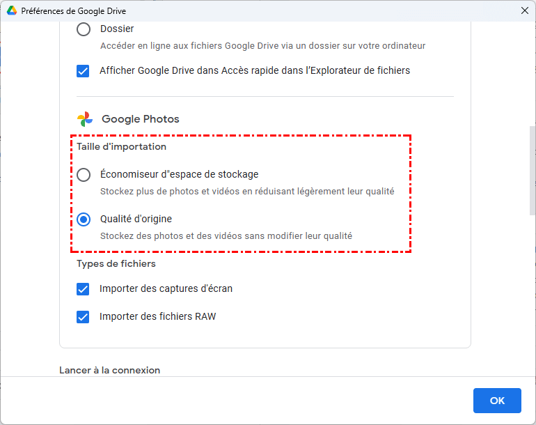 - Si vous sélectionnez l'option « Qualité d'origine », les photos occuperont l'espace de stockage de votre compte Google sans être compressées.