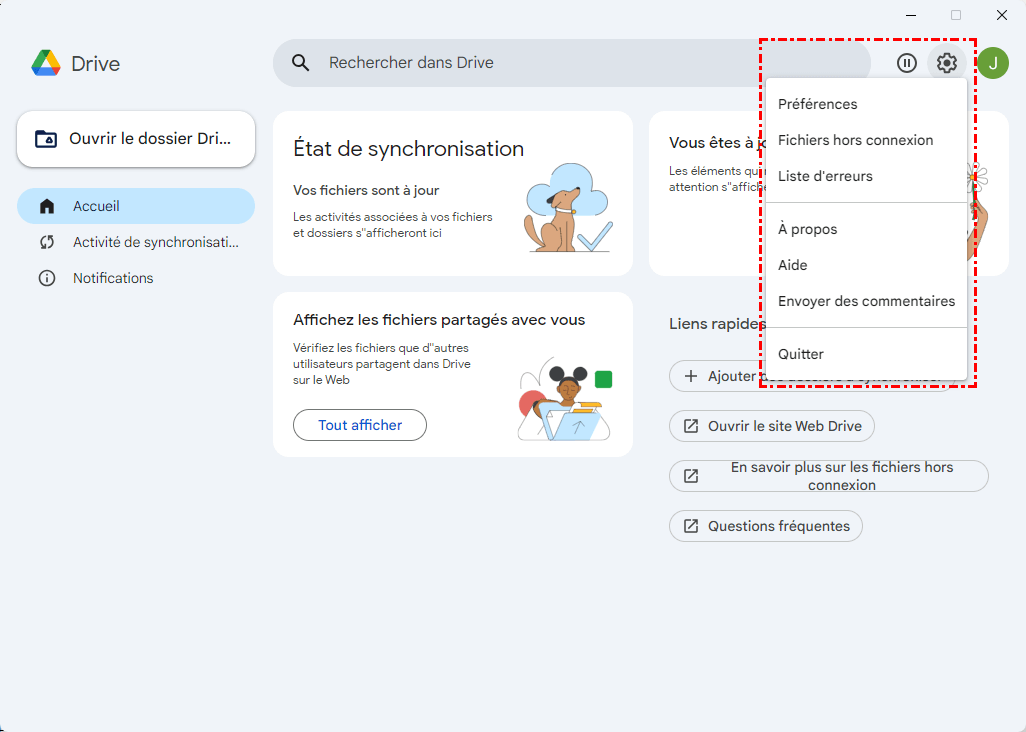 Pour interrompre la synchronisation de Google Drive, fermez simplement Drive pour ordinateur. Cliquez sur son icône dans la barre des tâches/barre d'état système en bas à droite. Une fenêtre s'ouvrira alors.