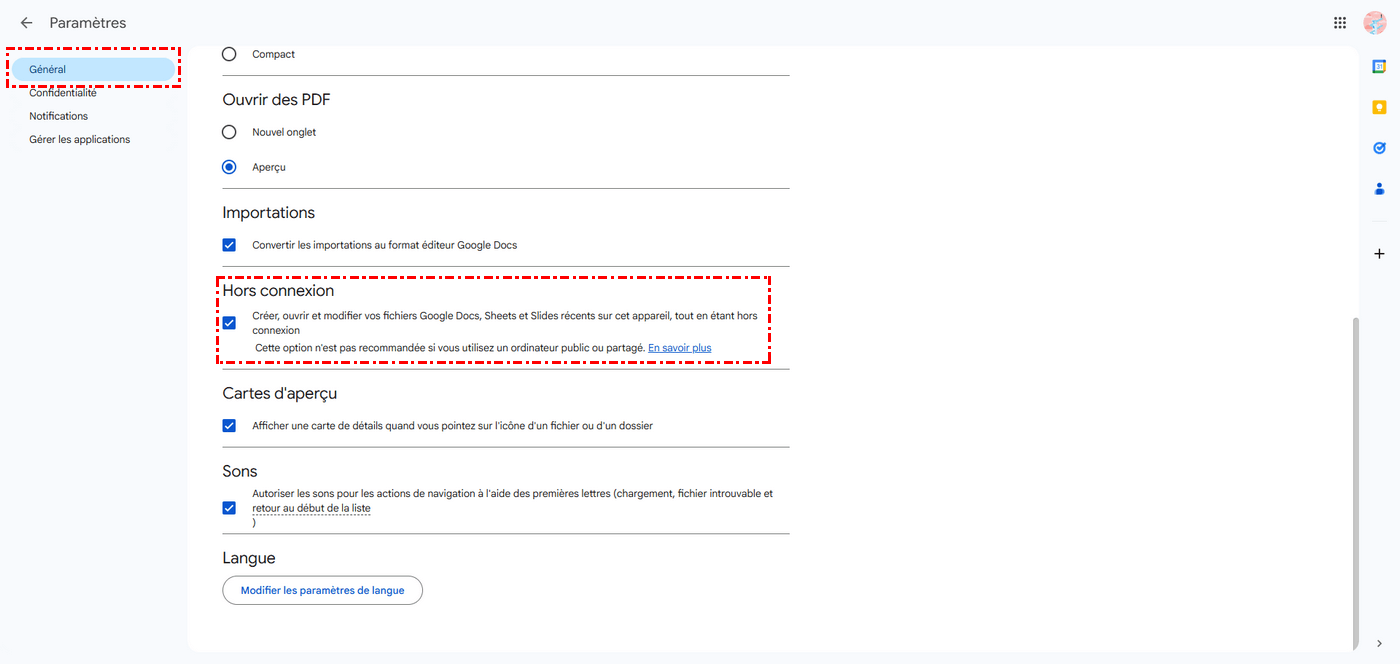 Accédez à https://drive.google.com/ et cliquez sur « Paramètres » (l'icône en forme d'engrenage en haut à droite de l'écran). Dans la fenêtre contextuelle, dans l'onglet Général par défaut, accédez à la colonne Hors connexion et décochez l'option « Créer, ouvrir et modifier vos fichiers Google Docs, Sheets et Slides recents sur cet appareil, tout en étant hors connexion ».