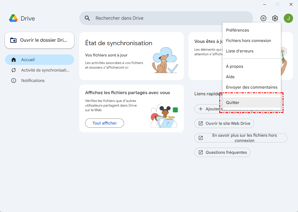 Cliquez sur le bouton « Paramètres » en haut à droite et sélectionnez « Quitter ». Cela fermera l'application Google Drive et arrêtera la synchronisation avec Google Drive.