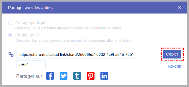 - Si vous choisissez le Partage privé, vous obtiendrez un lien partagé avec un mot de passe, puis les destinataires pourront utiliser le mot de passe pour ouvrir le lien partagé. Cependant, le Partage public ne vous fournit qu'un lien partagé sans mot de passe.