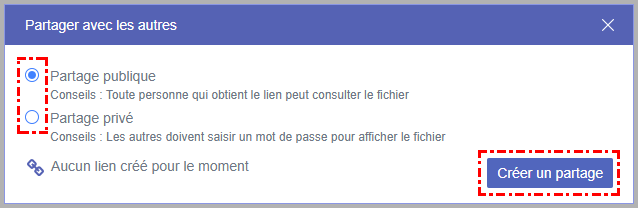 4. Choisissez ensuite Partage public ou Partage privé en fonction de vos besoins, puis cliquez sur Créer un partage.