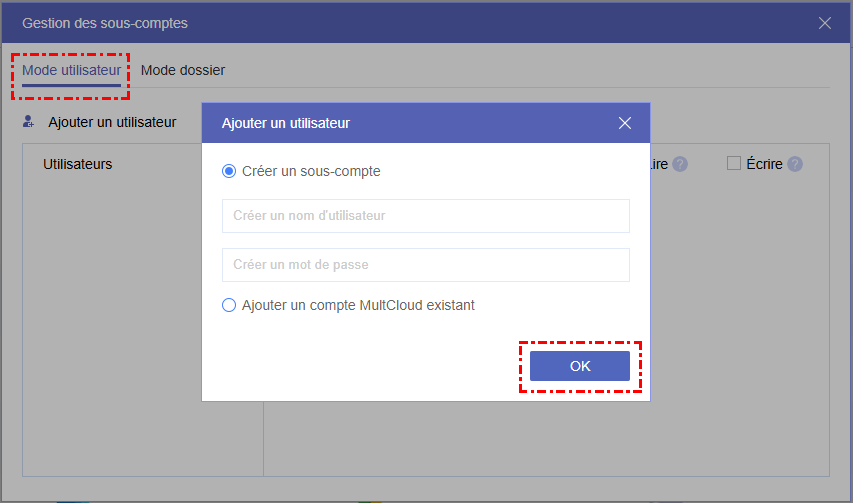 3. Cliquez sur Ajouter un utilisateur sous Mode utilisateur, puis cochez Créer un sous-compte ou Ajouter un compte MultCloud existant, saisissez l'adresse e-mail et (ou) le mot de passe, puis cliquez sur OK.
