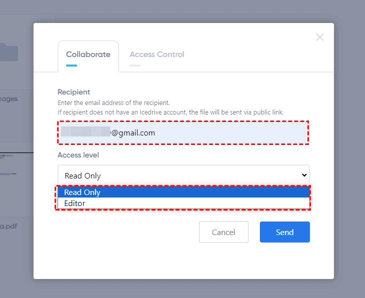 3. Saisissez l'adresse e-mail du destinataire, définissez le niveau d'accès « Lecture seule » ou « Éditeur », puis cliquez sur « Envoyer ».