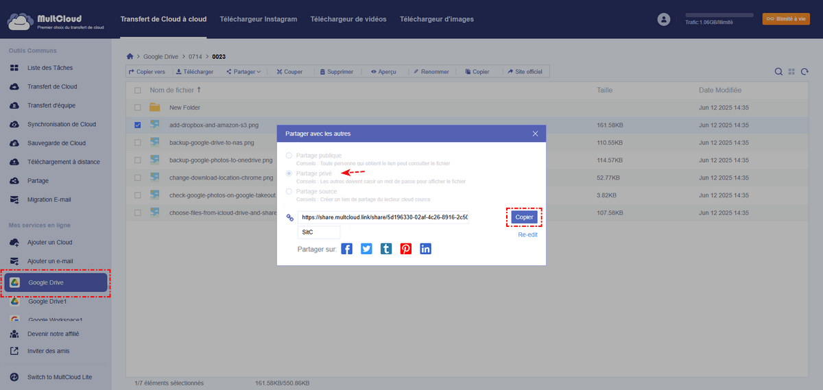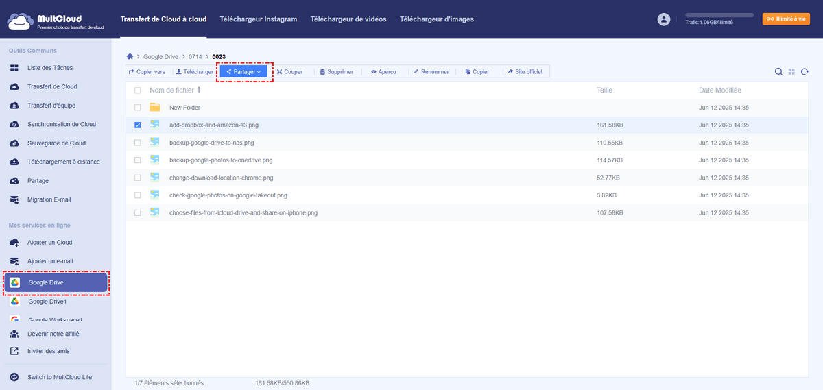 Dans MultCloud, vous devez utiliser la fonctionnalité "Partager" pour partager rapidement et en toute sécurité de gros fichiers sur Google Drive.