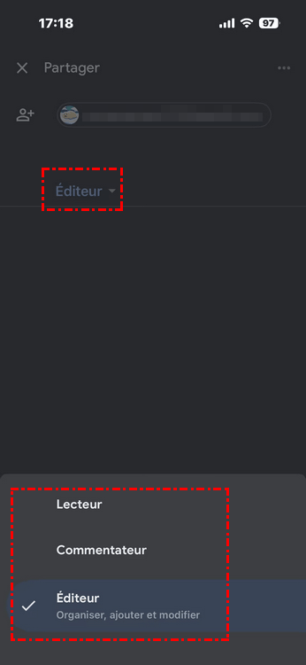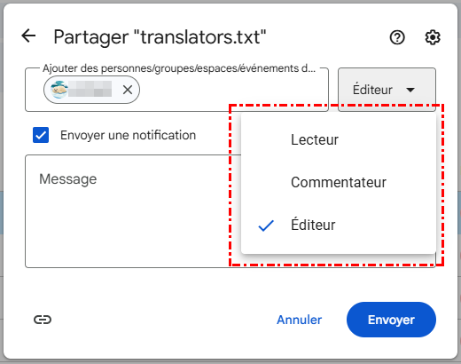Étape 3 : Cliquez sur le bouton « Éditeur » pour modifier les autorisations. Vous pouvez la changer en « Commentateur » ou « Lecteur ». Pour pouvoir télécharger le fichier, l'utilisateur doit disposer d'autorisations de modification ou de lecture.