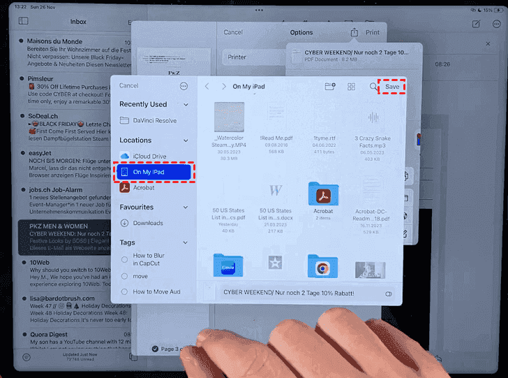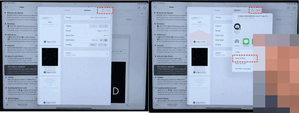Étape 3 : Cliquez sur Imprimer > Enregistrer dans les fichiers, puis sélectionnez Sur mon iPad et cliquez sur Enregistrer pour convertir un e-mail Gmail en PDF.