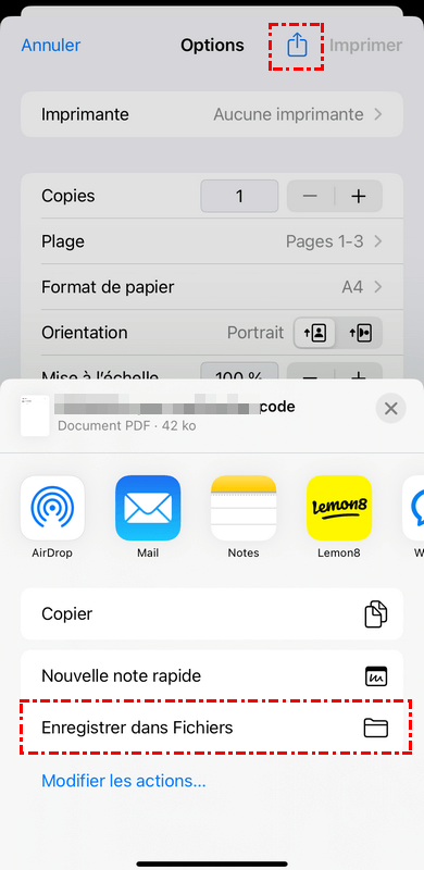 Étape 3 : Appuyez sur l’icône « Partager » en haut à droite de l’écran. Sélectionnez ensuite « Enregistrer dans Fichiers » et choisissez un dossier pour enregistrer ces fichiers. Après avoir effectué toutes les opérations, vous pouvez consulter les fichiers PDF dans l’application « Fichiers » de votre iPhone.