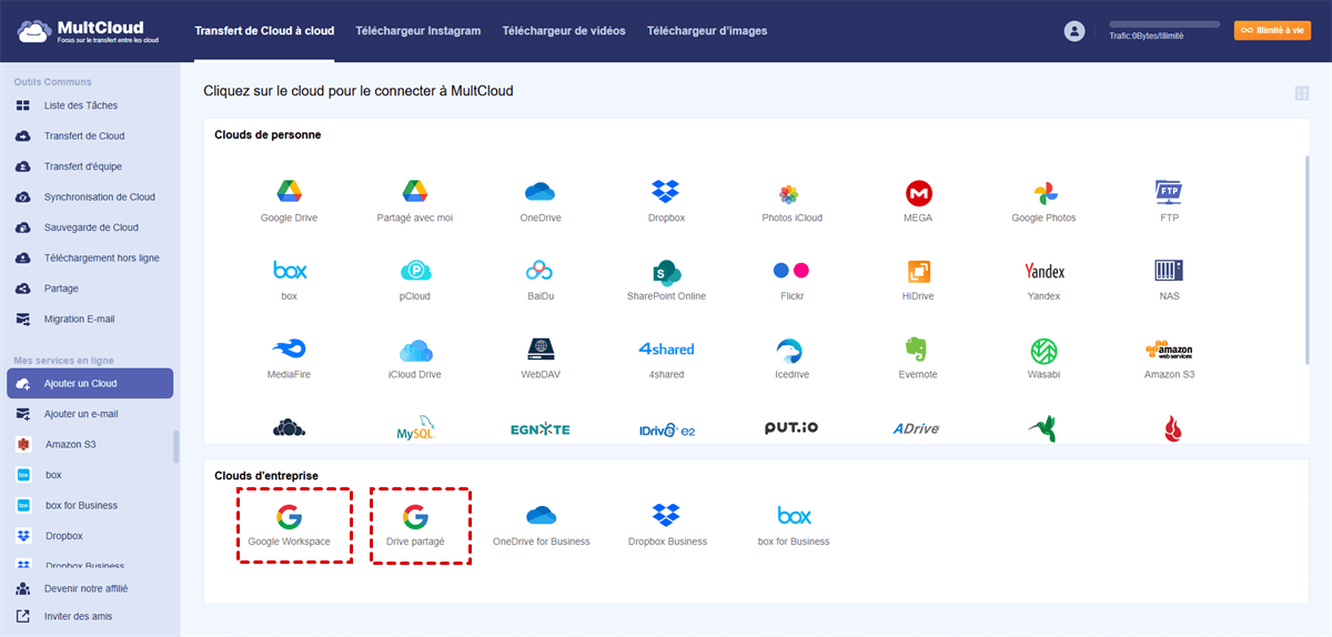 Cette méthode utilise un gestionnaire de stockage cloud multiple gratuit et performant. MultCloud vous permet de transférer des données entre plusieurs clouds depuis une interface unique et sans aucune opération complexe. Il offre plusieurs fonctionnalités multifonctions, telles que le Transfert de Cloud, Synchronisation de Cloud, Sauvegarde de Cloud, Téléchargement hors ligne et Gestion des Sous-comptes, pour gérer et transférer des données entre plus de 30 principaux services de stockage cloud.