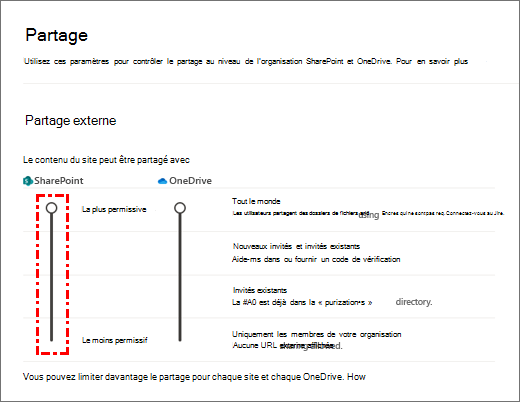 - Les paramètres de partage externe SharePoint de cette page sont identiques à ceux du Centre d'administration Microsoft 365, dans la page Paramètres de l'organisation > SharePoint.
