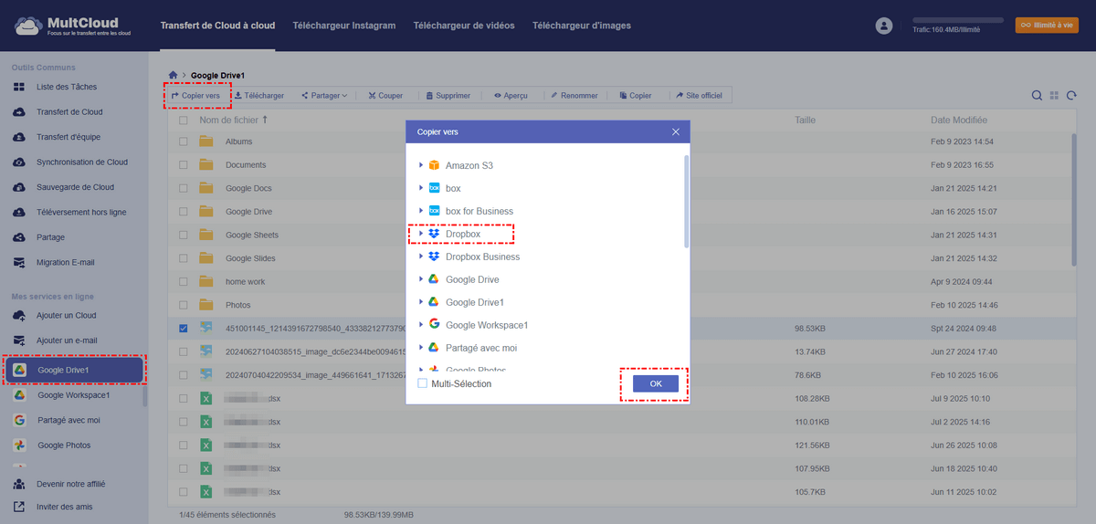 Si vous devez copier des fichiers de Google Drive vers Dropbox, MultCloud peut également vous aider avec la fonction « Copier vers ».
