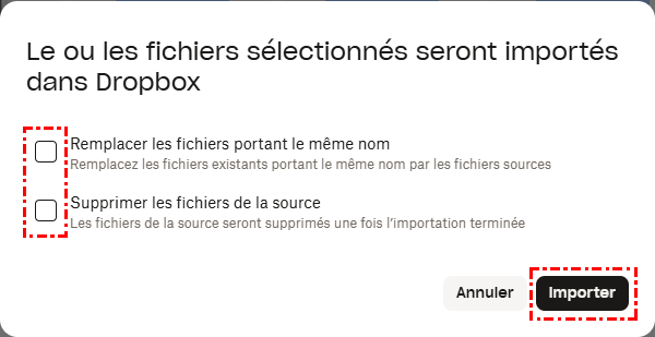5. Cochez « Remplacer les fichiers portant le même nom » ou « Supprimer les fichiers de la source » selon vos besoins, puis cliquez sur « Importer ».