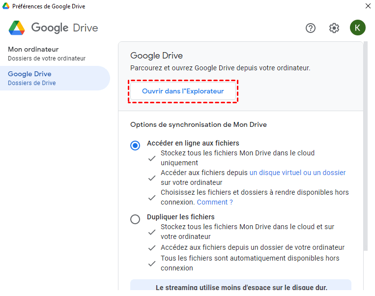 Étape 3 : Accédez à Google Drive et cliquez sur Ouvrir dans l'Explorateur. Vous verrez alors apparaître un dossier Google Drive.