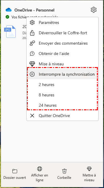 Étape 2 : Faites un clic droit sur l'icône et sélectionnez l'option « Interrompre la synchronisation ». Choisissez ensuite la durée de suspension souhaitée, par exemple 2 heures ou 24 heures.