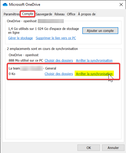 Étape 2. Accédez à l'onglet « Compte », puis cliquez sur « Arrêter la synchronisation » à côté du dossier SharePoint que vous souhaitez désynchroniser.