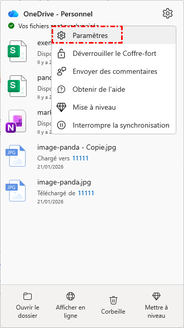 Étape 1. Cliquez avec le bouton droit sur l'icône OneDrive dans la barre d'état système Windows ou dans la barre de menus Mac, puis sélectionnez « Paramètres ».