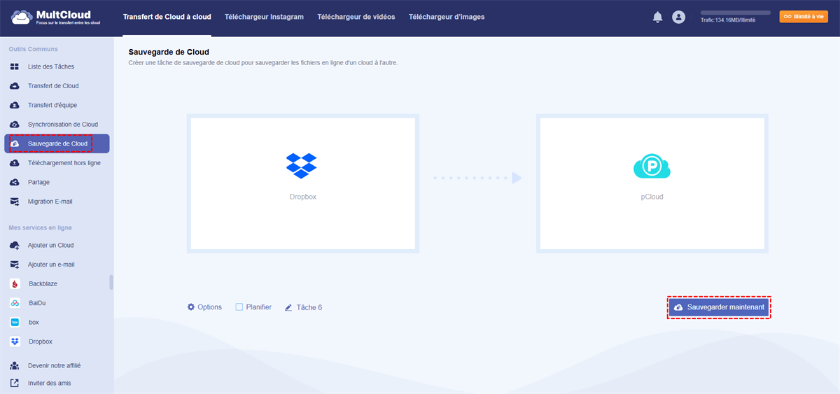 Lorsque vous sauvegardez Dropbox vers pCloud, vous devez utiliser la fonction Sauvegarde de Cloud prise en charge par MultCloud.