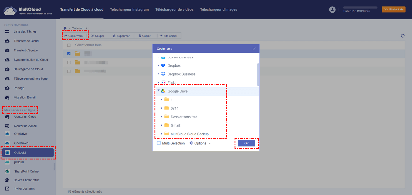 Voici les étapes simples pour enregistrer vos e-mails Outlook sur Google Drive avec MultCloud :
