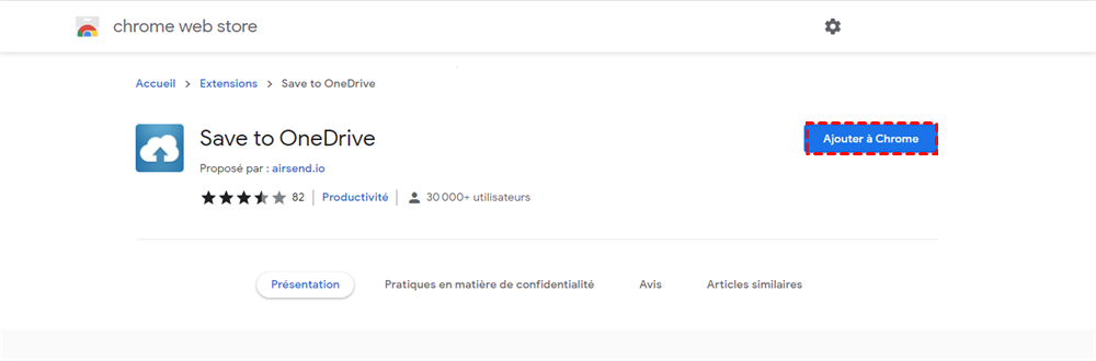 Étape 1. Visitez la page de l'extension Save to OneDrive et cliquez sur Ajouter à Chrome pour l'installer. Une fois l'extension OneDrive enregistrée dans votre liste d'extensions, vous pourrez utiliser les fonctionnalités de OneDrive dans votre système.