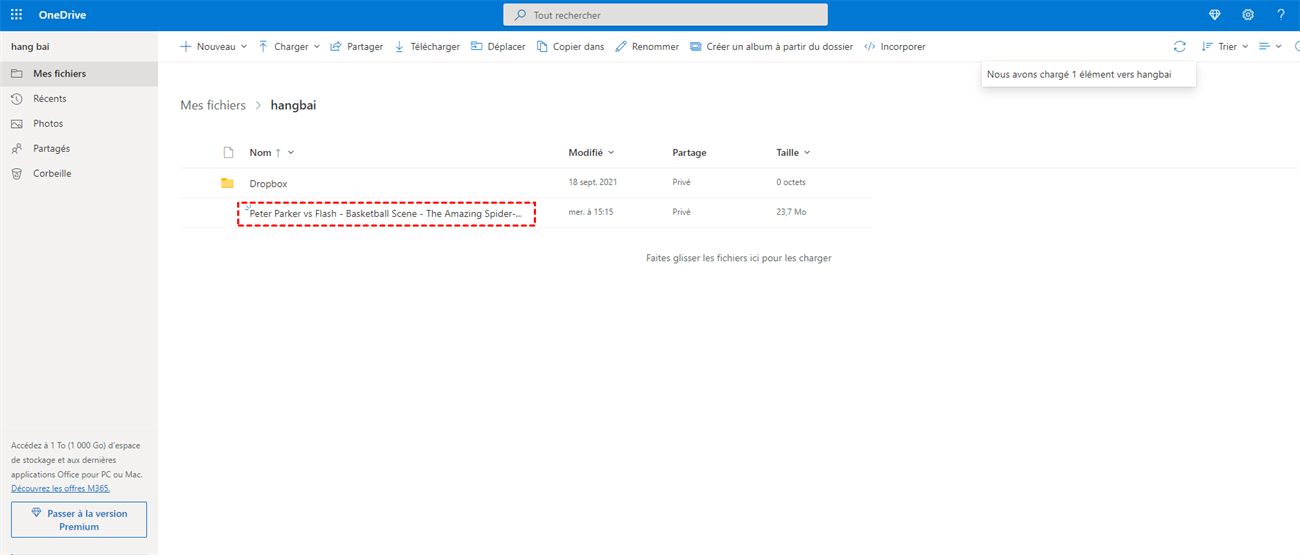 Étape 4. Recherchez ensuite la vidéo YouTube que vous venez de télécharger localement, cliquez sur Ouvrir et la vidéo sera enregistrée sur OneDrive. Vous pouvez voir le processus de chargement de la vidéo dans le coin inférieur droit.