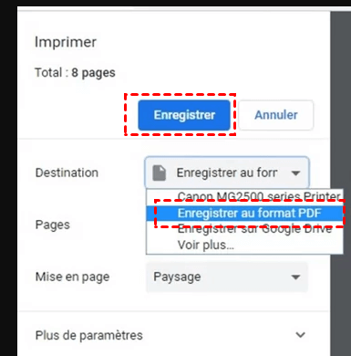 3. Cliquez sur Imprimer, puis choisissez Enregistrer au format PDF dans le champ Destination, puis cliquez sur Enregistrer.