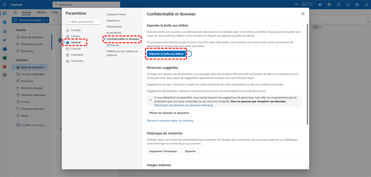 2. Cliquez ensuite sur l'icône Paramètres > Général > Confidentialité et données > Exporter la boîte aux lettres.