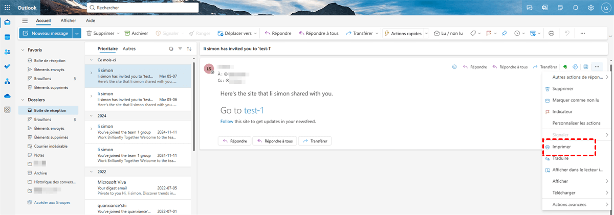 2. Ouvrez un e-mail Outlook et sélectionnez « Imprimer » dans la barre d'outils en haut.