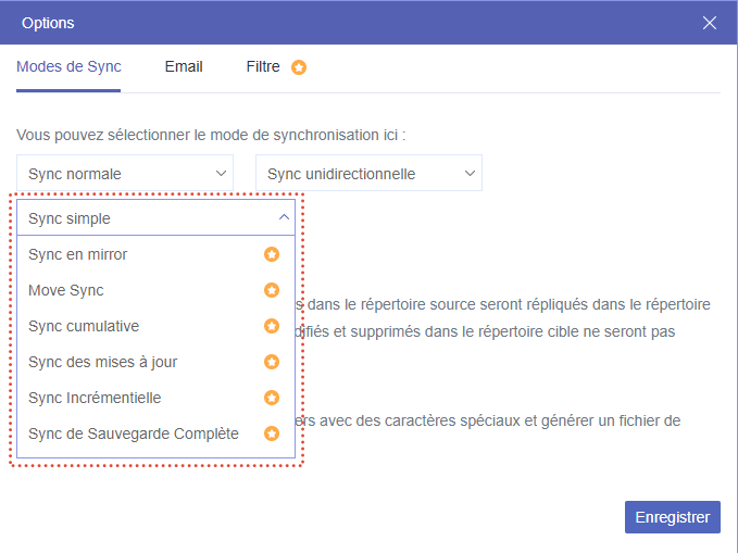 - Synchronisation de déplacement : Tous les fichiers synchronisés du répertoire source sont supprimés une fois la synchronisation terminée.