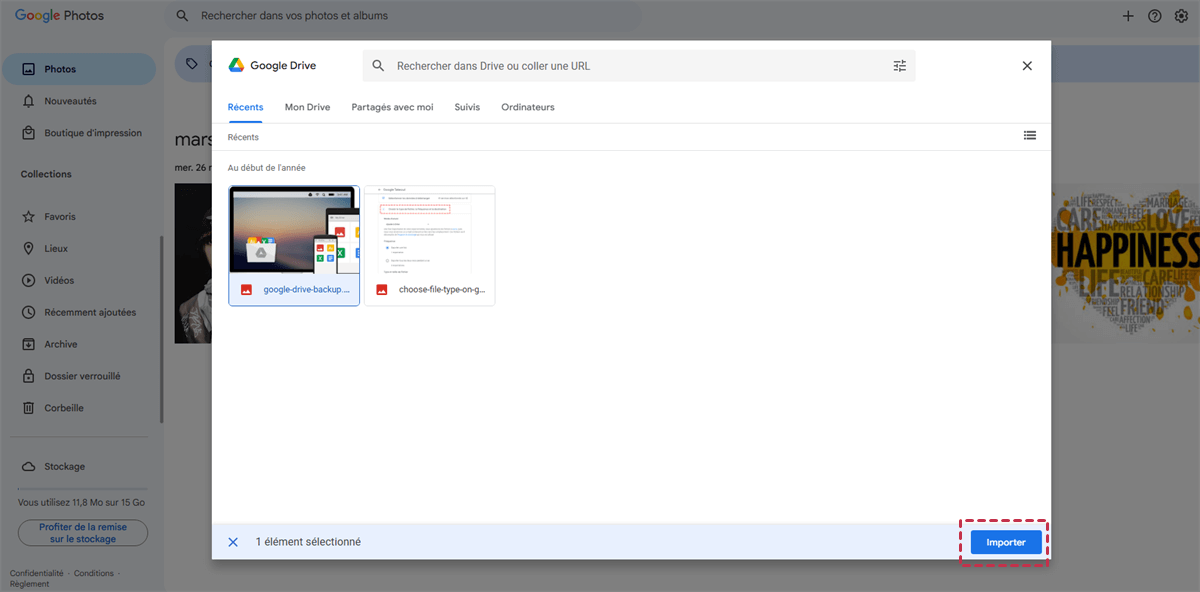 Étape 3. Une fenêtre Google Drive plus petite s'ouvrira. Vous pourrez y sélectionner des photos ou des vidéos parmi « Mon Drive », « Partagés avec moi » ou « Ordinateurs » (si vous avez synchronisé les photos de votre ordinateur avec Google Drive).