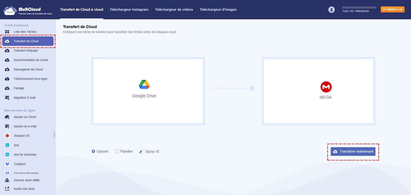 Si vous ne souhaitez pas payer pour plus d'espace de stockage, vous pouvez transférer des fichiers volumineux de Google Drive vers un autre cloud, puis les supprimer de Google Drive pour libérer de l'espace. Pour simplifier au maximum le transfert de fichiers de Google Drive vers d'autres clouds, nous vous recommandons d'utiliser MultCloud, un outil professionnel de migration cloud à cloud. Il vous permet de transférer directement des fichiers Google Drive vers Dropbox, OneDrive, MEGA ou d'autres clouds sans passer par votre ordinateur local.