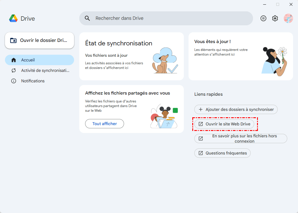 Vous pouvez tester votre connexion en ouvrant un navigateur web et en consultant n’importe quel site web pour vérifier la connectivité. Si votre connexion est instable, les fichiers risquent de ne pas se synchroniser avec le cloud Google Drive.
