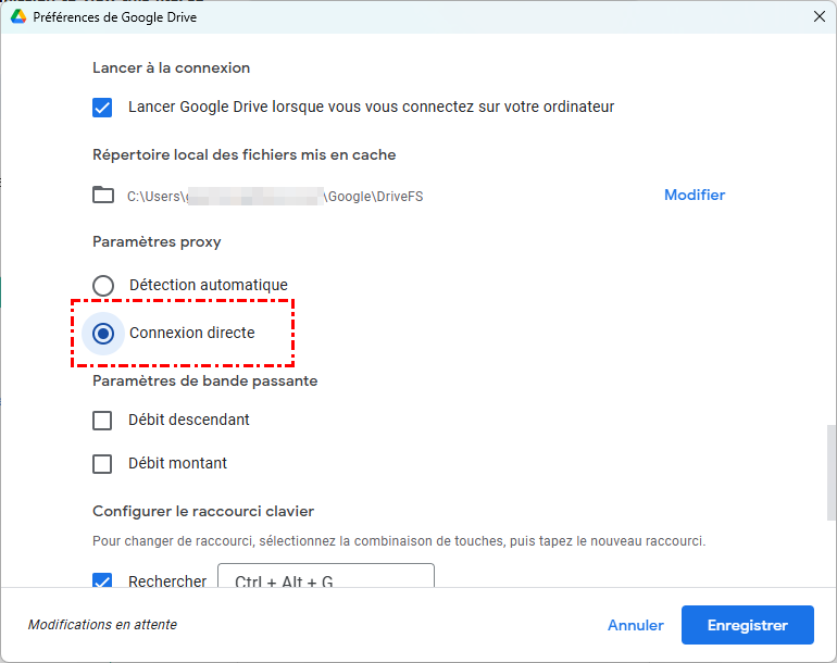 Déplacer les paramètres du proxy de « Détection automatique » à « Connexion directe » et déplacer le dossier Google Drive local vers « C:\Google Drive » devrait résoudre le problème de synchronisation incomplète des fichiers par Google Drive.