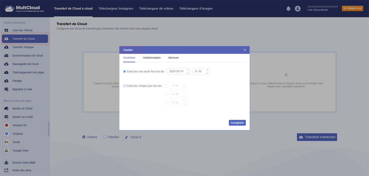 Étape 4 : Vous pouvez configurer votre tâche de transfert en appuyant sur « Options » en bas à gauche. Par exemple, vous pouvez cocher « Supprimer tous les fichiers sources une fois le transfert terminé » ou « Conserver les données de modification du fichier ». Vous pouvez également configurer la planification du transfert en appuyant sur « Planifier » : transferts quotidiens, hebdomadaires ou mensuels. Par exemple, vous pouvez transférer des données de Dropbox vers SharePoint mensuellement.