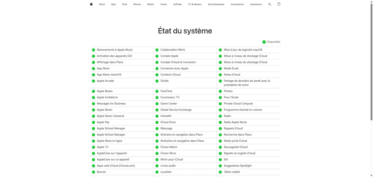 Rendez-vous sur la page État du système Apple pour vérifier si les services iCloud rencontrent actuellement des problèmes. Si Apple rencontre des problèmes de son côté, vous devrez peut-être attendre qu'ils soient résolus.