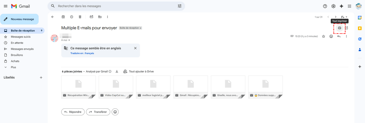 1. Ouvrez l'e-mail contenant plusieurs e-mails, puis cliquez sur l'icône "Tout imprimer" en haut à droite.