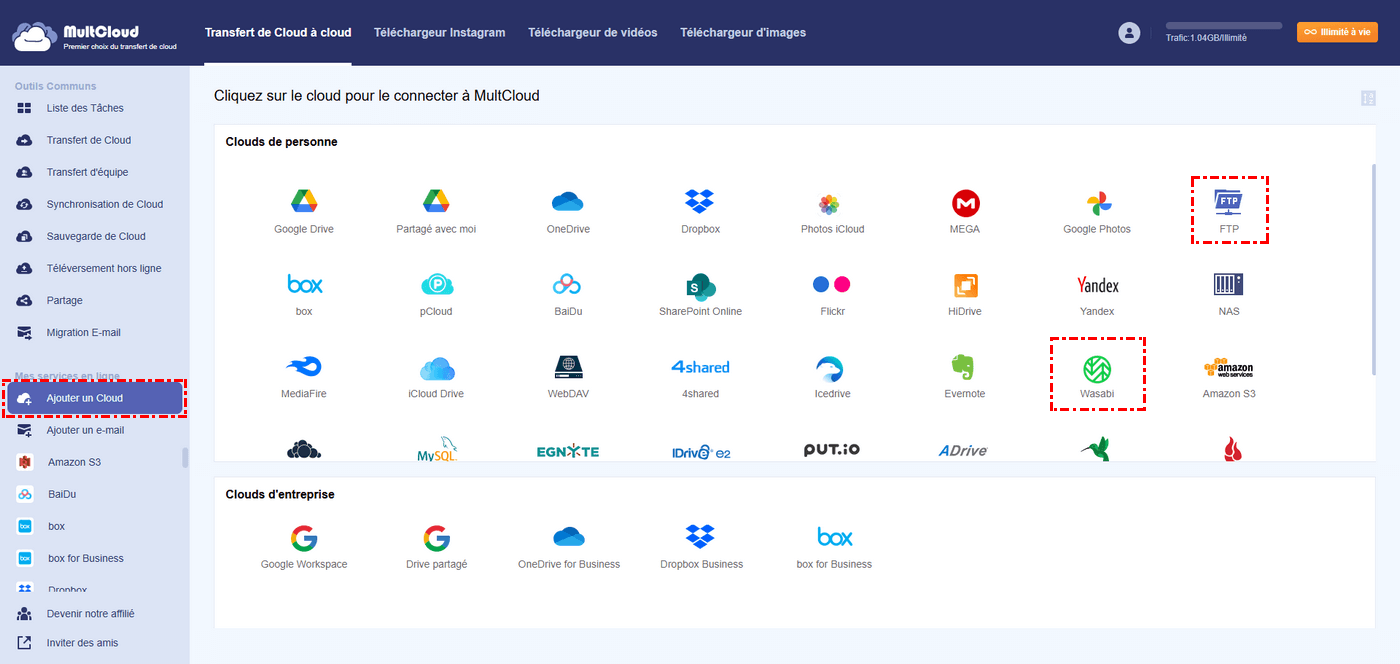 Comment intégrer FTP et Wasabi avec Synchronisation de Cloud de MultCloud ?