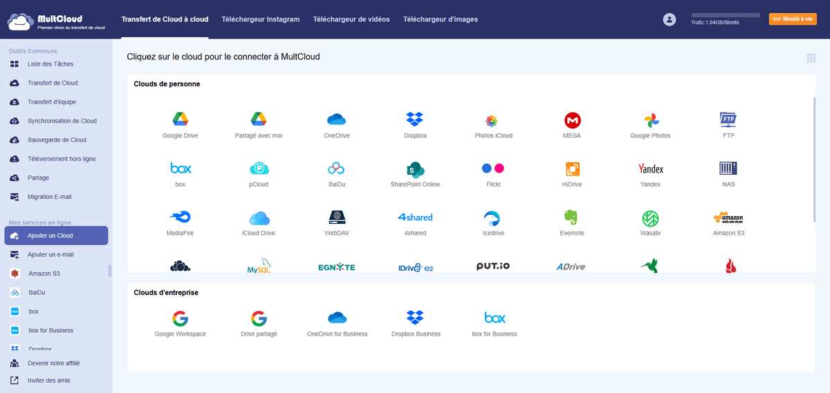 MultCloud offre de multiples fonctions, notamment Transfert de Cloud (transfert de cloud à cloud sans téléchargement), Synchronisation de Cloud, Sauvegarde de Cloud (sauvegarde et restauration avec gestion des versions), Migration E-mail (enregistrement des e-mails dans le cloud au format PDF), Sauvegarde d'images (enregistrement d'images provenant d'Instagram, de Google Search et d'autres sites Web sur un disque local ou dans le cloud), etc. Pour intégrer FTP et Wasabi, la fonction Synchronisation Cloud peut vous rendre un grand service.