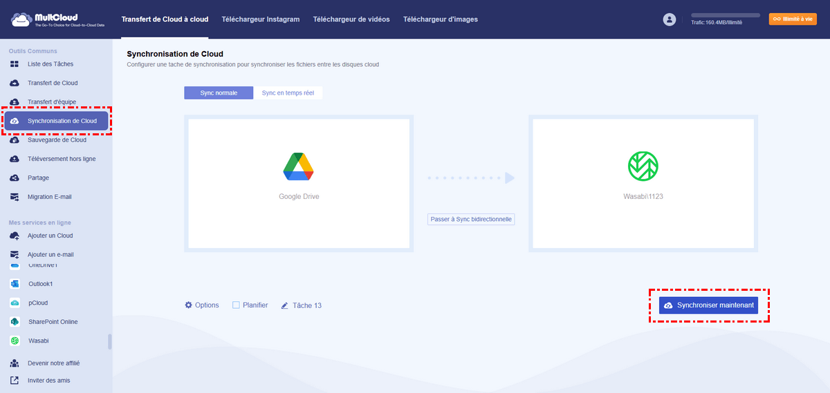 Pour intégrer Google Drive à Wasabi, vous pouvez utiliser la fonctionnalité Synchronisation de Cloud de MultCloud pour synchroniser facilement Google Drive avec Wasabi grâce à l'un des 10 modes de synchronisation disponibles.