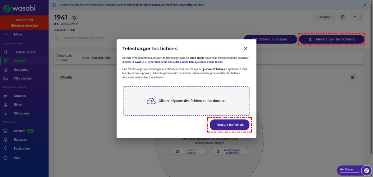 Étape 5. Cliquez sur le bouton « Télécharger les fichiers », puis sur « Parcourir les fichiers » pour transférer des fichiers Google Drive vers Wasabi. Vous pouvez également glisser-déposer des fichiers depuis votre ordinateur vers Wasabi.