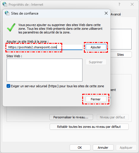 Étape 3. Dans le champ « Ajouter ce site web à la zone », saisissez l'URL SharePoint. Cliquez sur « Ajouter » et « Fermer ».