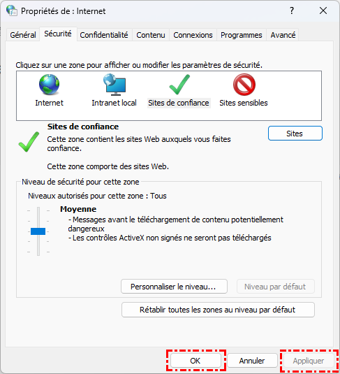 Étape 4. Revenez à la fenêtre « Propriétés Internet », cliquez sur « OK » pour fermer, puis « Appliquer » les modifications.