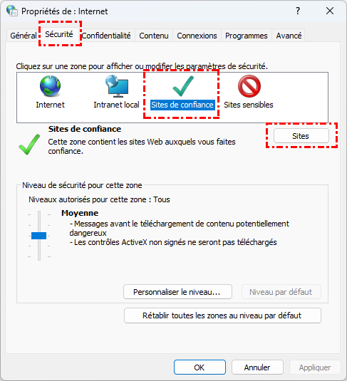 Étape 2. Dans la fenêtre « Propriétés de : Internet », accédez à l'onglet « Sécurité ». Cliquez sur « Sites de confiance » dans la liste des zones. Cliquez ensuite sur « Sites ».