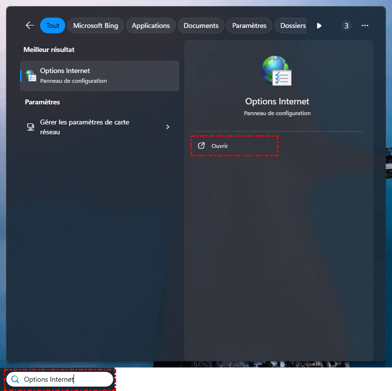 Étape 1. Cliquez sur le bouton « Démarrer », puis saisissez « Options Internet » dans le champ de recherche. Cliquez ensuite sur le bouton « Ouvrir ».