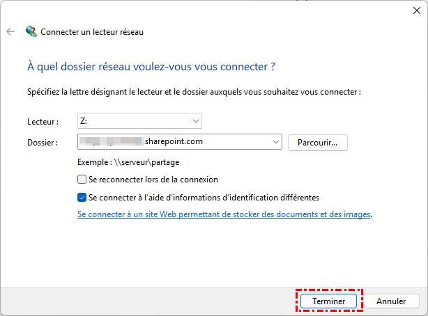 Étape 4. Sélectionnez les options « Se reconnecter lors de la connexion » et « Se connecter à l'aide d'informations d'identification différentes » selon vos besoins, puis cliquez sur le bouton « Terminer ». Une invite de connexion pourrait s'afficher. Saisissez vos identifiants Office 365, puis cliquez sur « OK ».