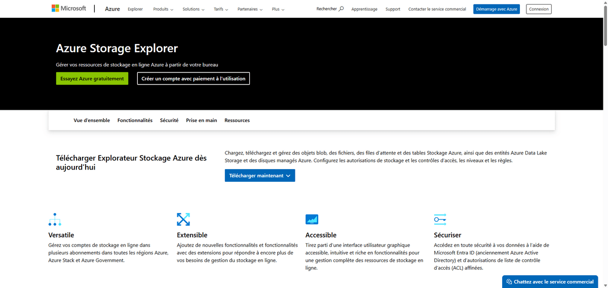 - Prise en charge de divers types de données et systèmes : Vous pouvez gérer divers types de données provenant de différents services, gérer les ressources de stockage cloud Azure à partir de Windows, macOS ou Linux, vous connecter en toute sécurité via HTTPS, travailler hors ligne et gérer sans effort les blobs, les tables, les files d'attente et les fichiers.