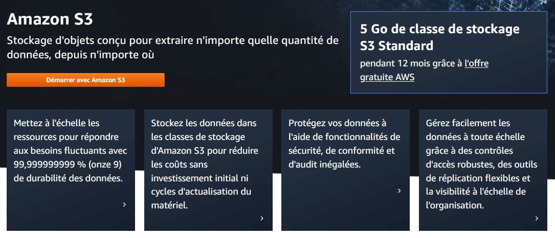 Le Stockage AWS ne propose pas qu'un seul type de service de stockage. Il vous offre diverses options pour gérer plus efficacement différents types de fichiers et de données. Ces options comprennent le stockage permettant de conserver les données disponibles à tout moment, le stockage pour les bases de données, la migration vers le cloud, l'archivage à long terme et le stockage pour la sauvegarde en cas d'urgence.
