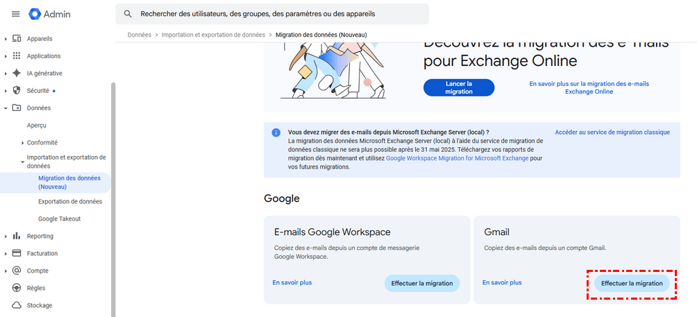 Étape 2 : Développez le menu « Admin », appuyez sur l'icône « Migration des données (Nouveau) ». Ensuite cliquez sur « Effectuer la migration » sous Gmail.