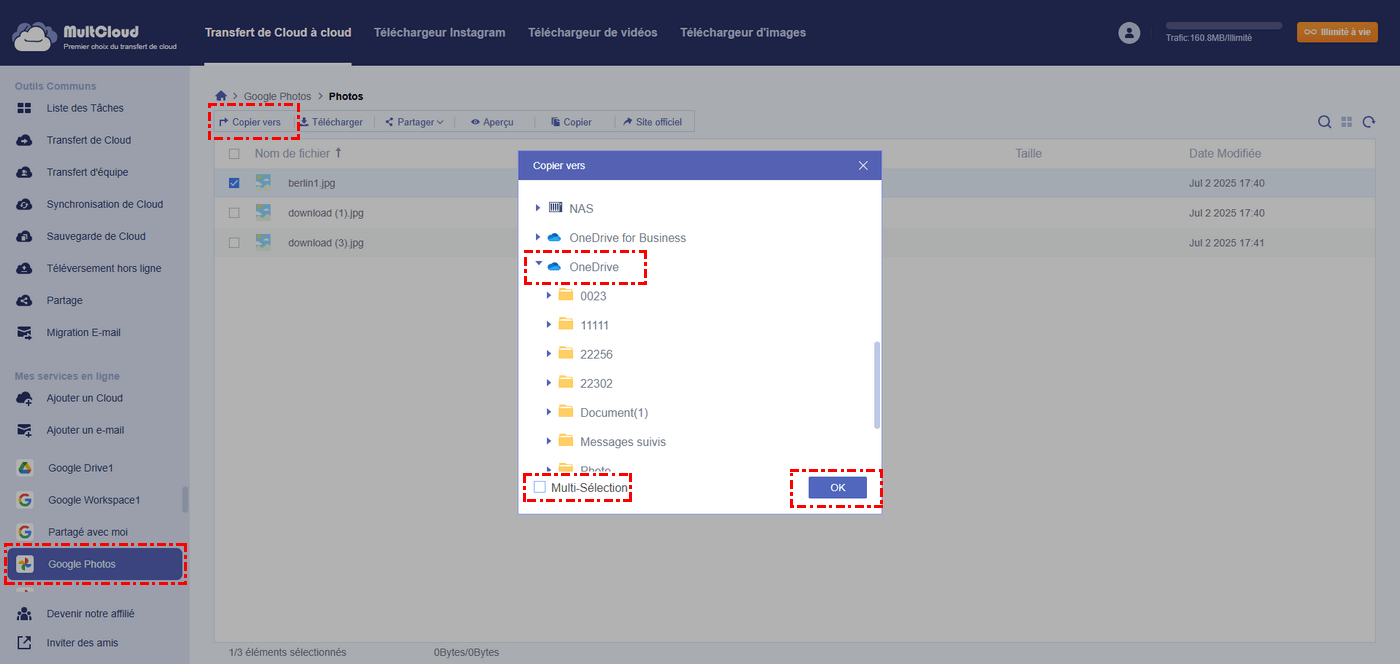 Le transfert de Google Photos vers OneDrive est facile avec MultCloud. Il existe trois façons d'utiliser OneDrive au lieu de Google Photos. Ces trois solutions sont également applicables au transfert de photos de OneDrive vers Google Photos.