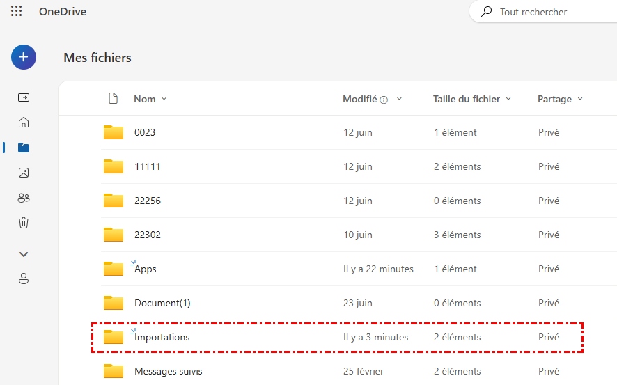 7. Vérifiez ensuite les fichiers importés dans le dossier « Importations » de la section « Mes fichiers » de OneDrive.