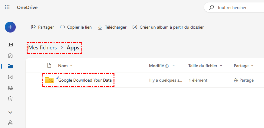 Étape 3. Acceptez les autorisations. Une fois terminé, connectez-vous à votre compte OneDrive et cliquez sur « Mes fichiers ». Vous verrez les données exportées depuis Google Photos dans le dossier « Google Download Your Data ».